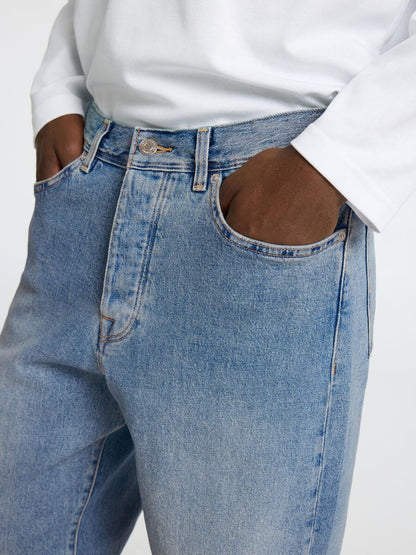 Perfectionnez votre garde-robe off-duty avec ce jean au délavage léger. Avec sa coupe ample et sa taille mi-haute, ce jean offre une allure décontractée, parfaite pour le week-end. Disponible dans un bleu délavé, notre équipe style le recommande avec des baskets, un T-shirt rayé et un bomber. - Taille mi-haute - Braguette zippée surmontée d'un bouton - Passants de ceinture - Design à 5 poches - Coupe ample