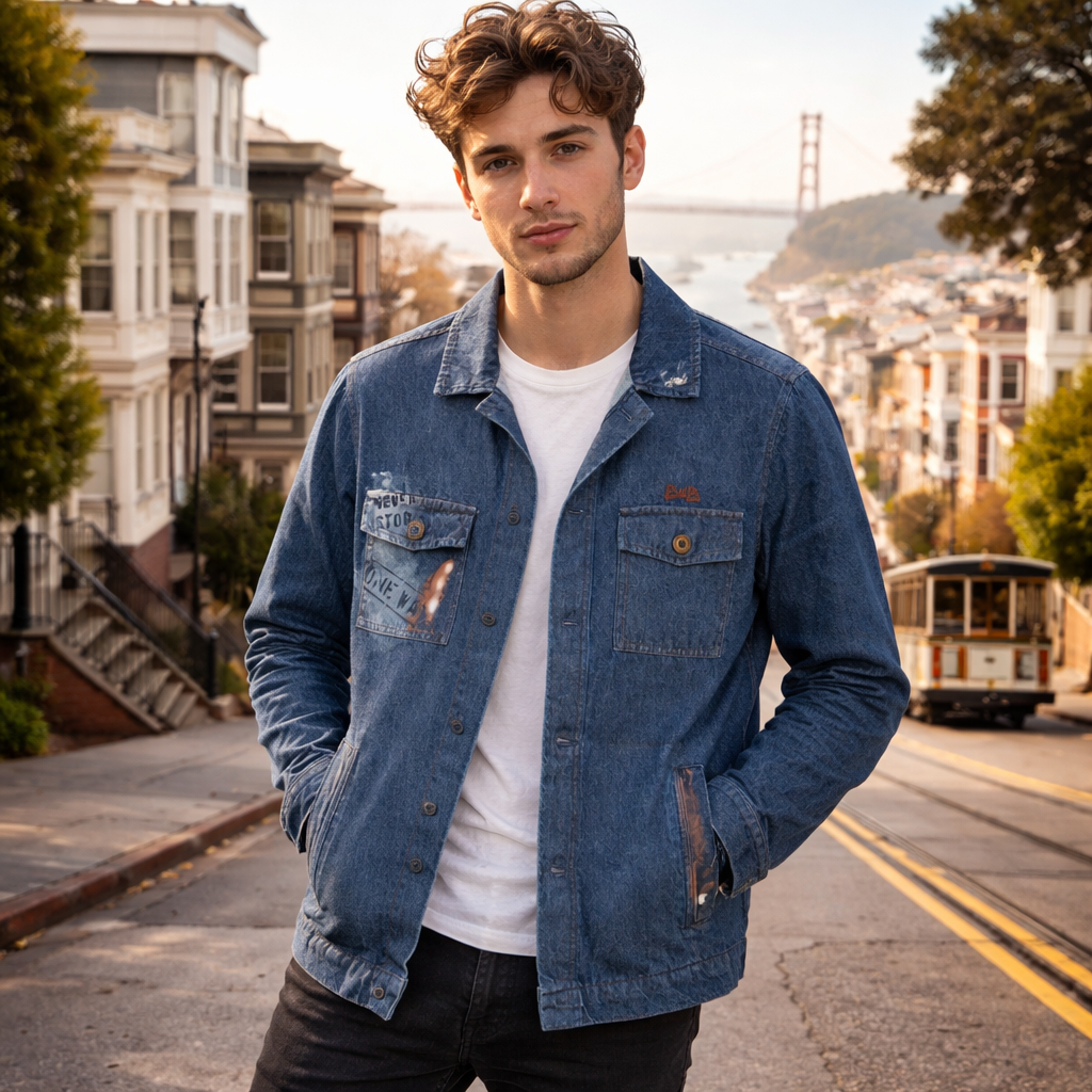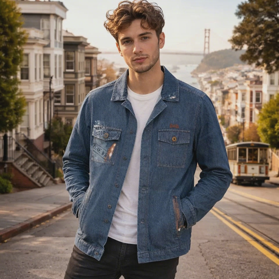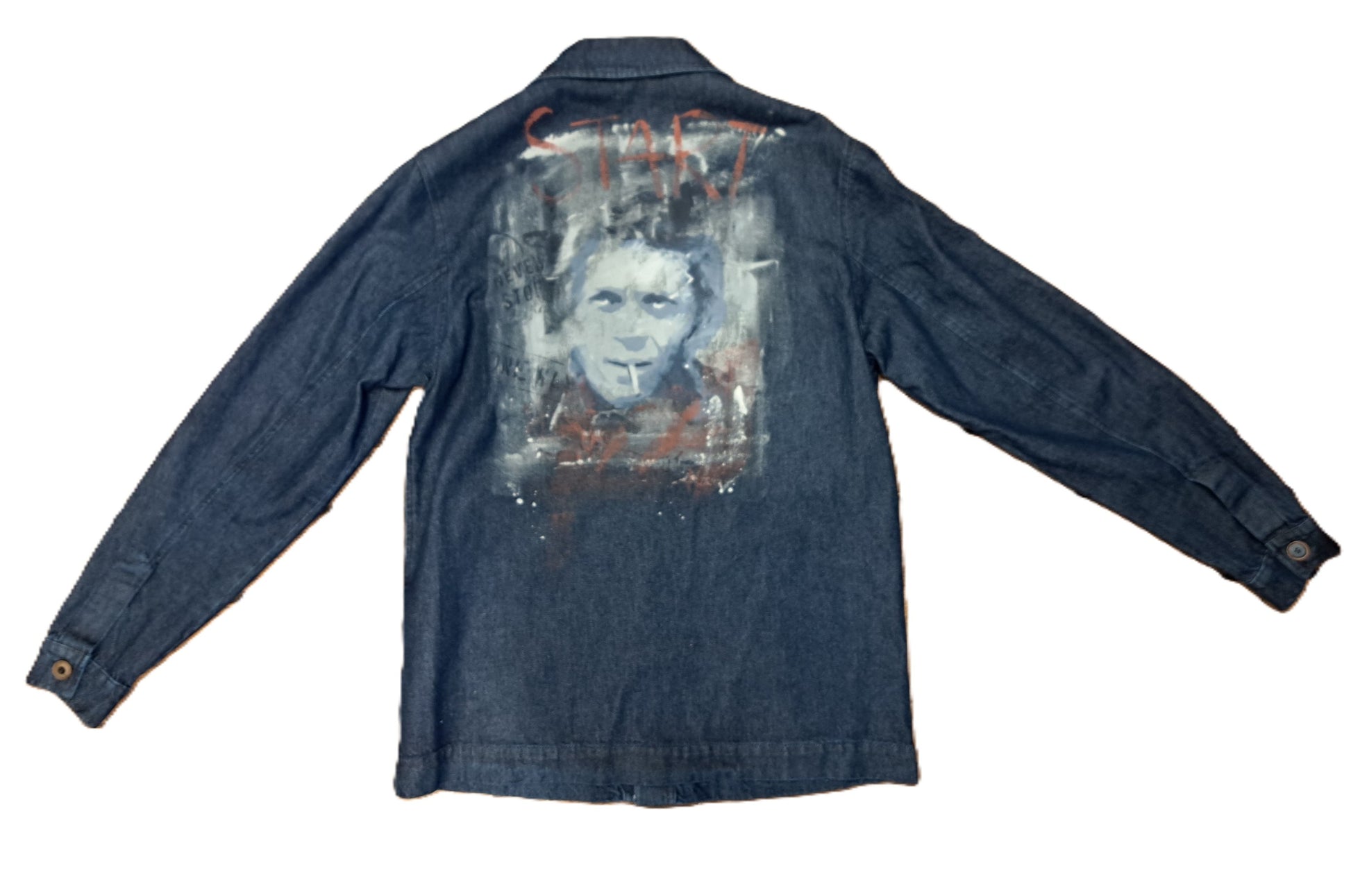 Veste atelier signée Bob the compagny, alliant fonctionnalité et style rock. Confectionnée en denim robuste, elle arbore des manches longues et un dos orné d'une peinture aérographe représentant l'icône Steve McQueen. Pièce incontournable pour les amateurs d'authenticité et de détails soignés, cette veste combine protection et caractère.